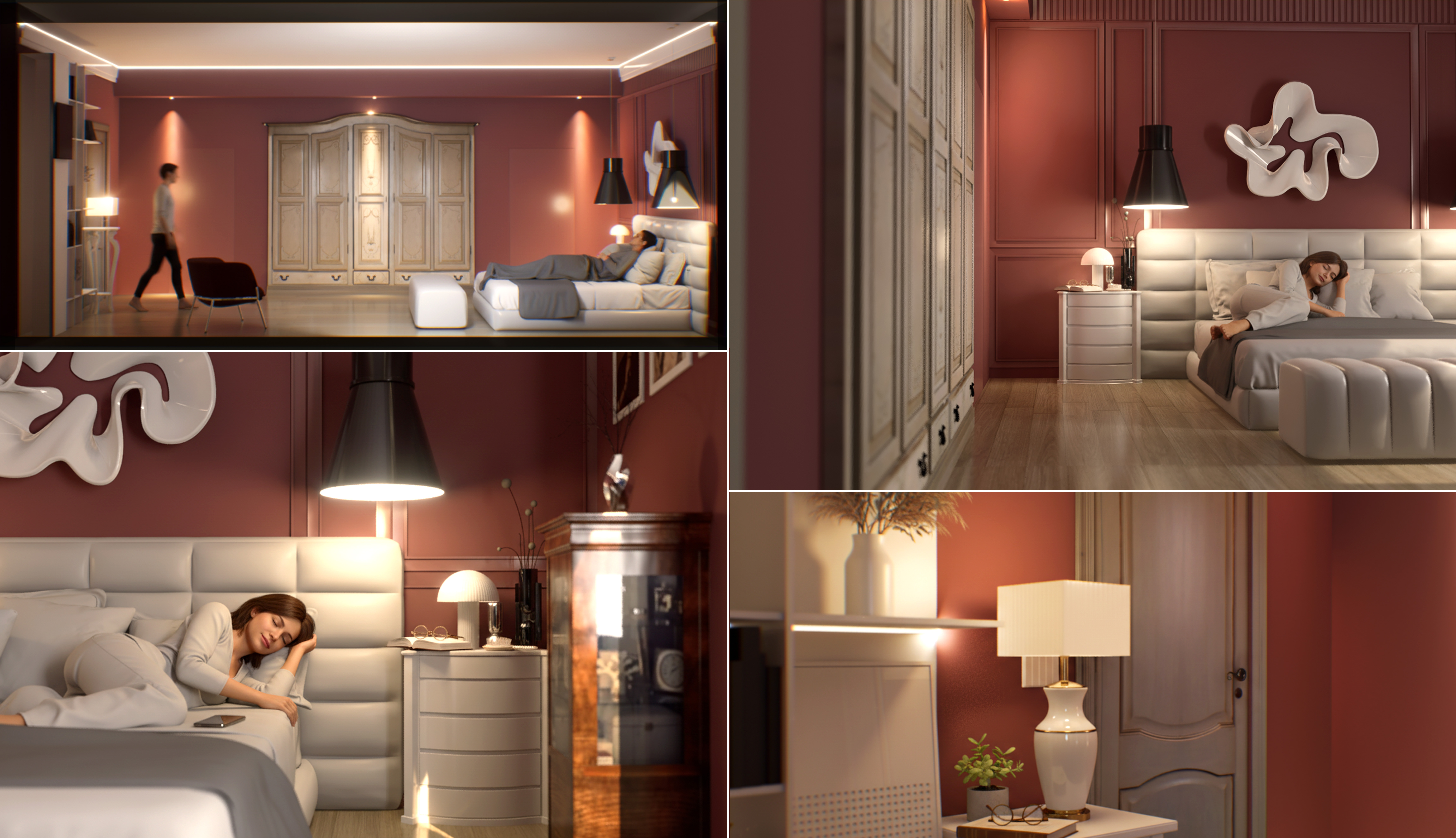 All surface are modelled by hand, except for the bed, that i found around the web and lamps from blender asset.