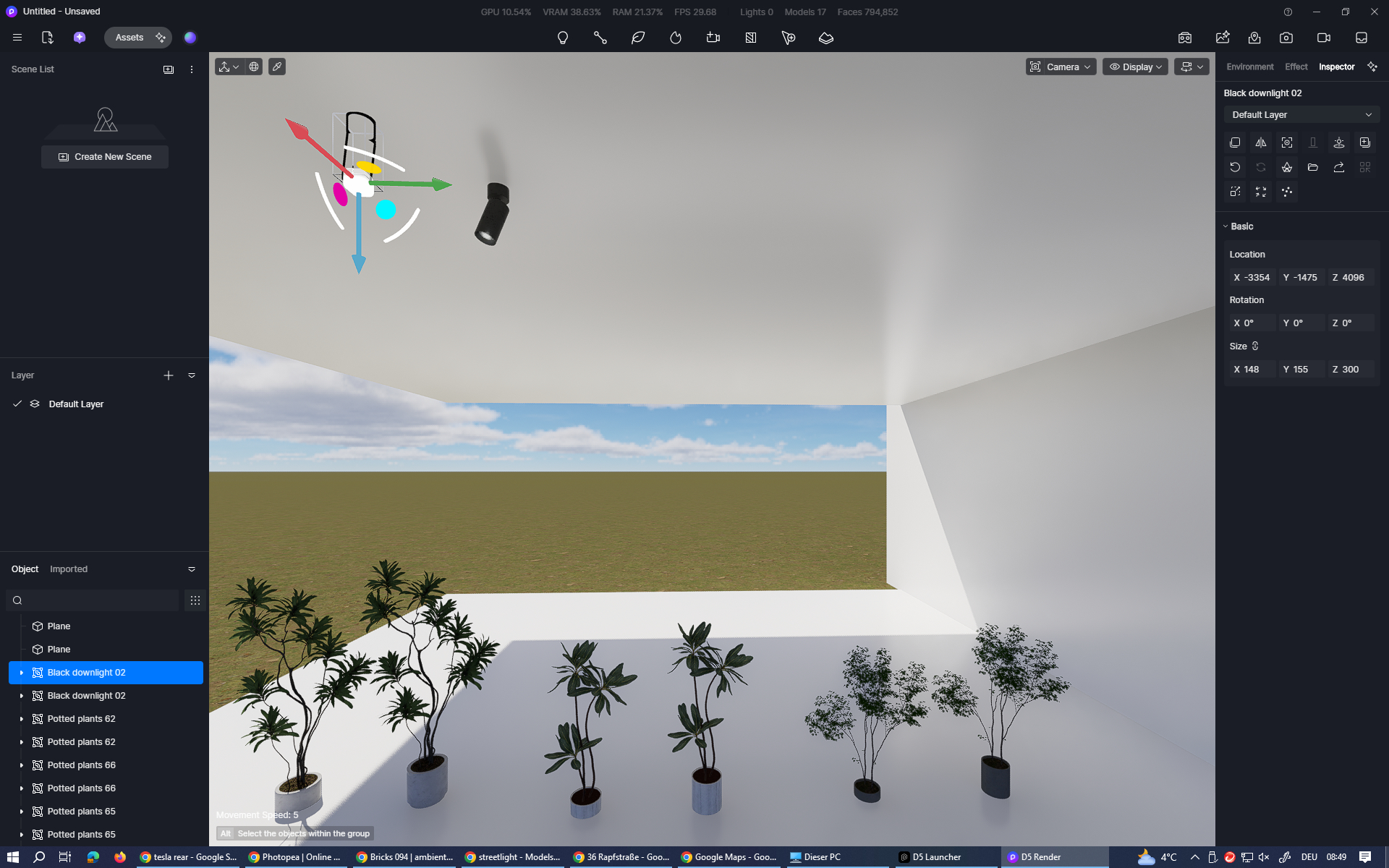 there is also an example for the downlights. left one you can’t see, because it’s IN the ceiling when the asset is placed in the scene (because pivot point is on the bottom of the object). i did not check every object in the downlights folder, but it seems that almost every downlight has the pivot point on the bottom. so, when placing downlights you have to manually move every light down.