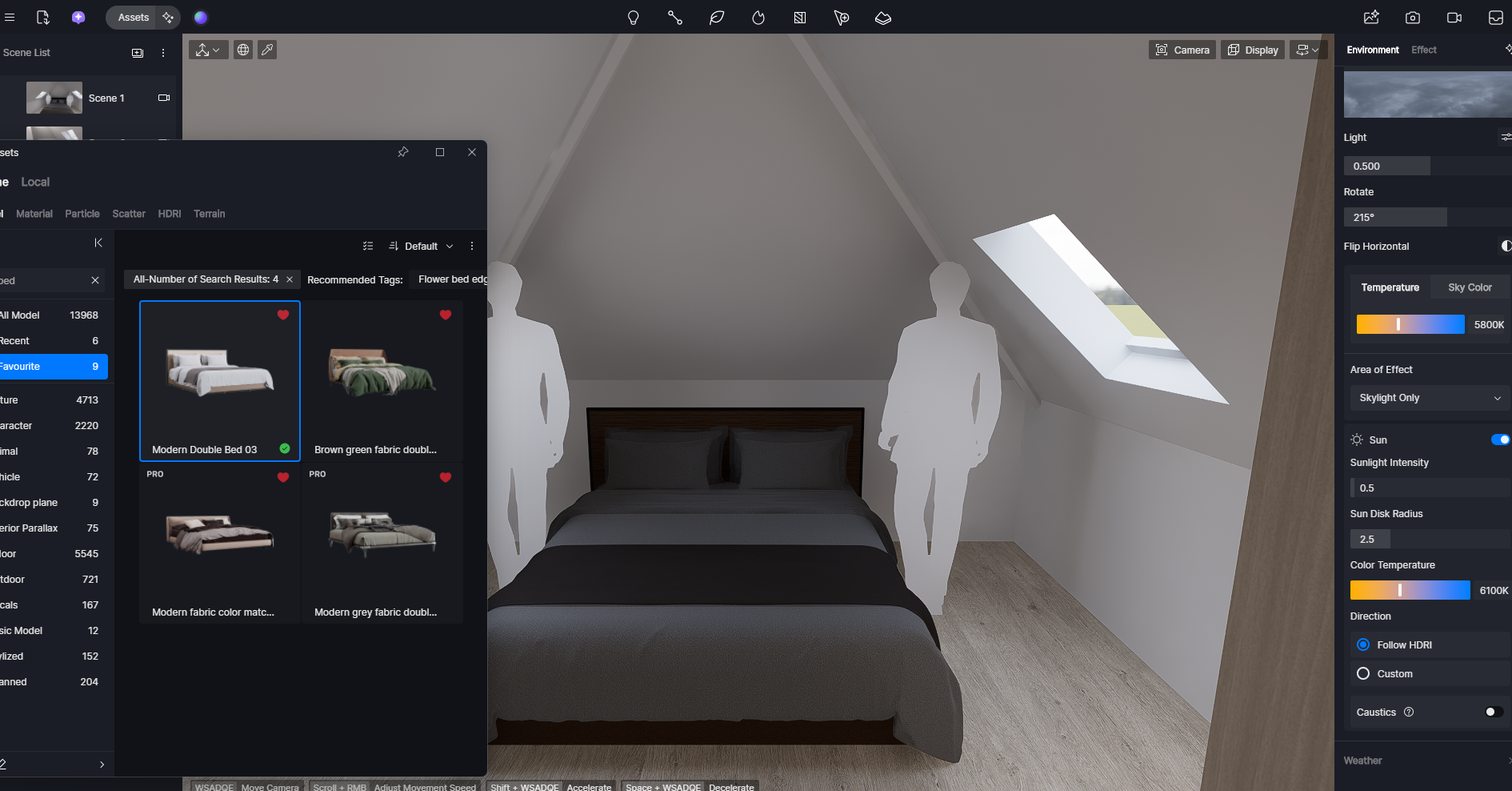 A number of the assets, bed in this case, are much darker than the thumbnail appears. The thumbnail is white/light brown, but the bed is grey/dark brown