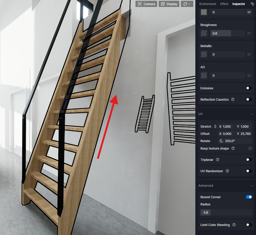 Hi Tyler, to help you for the next project you will do, I give you a straight. When I use my graphics program and insert the textures of the materials, they appoint them like “oak wood”. But when it happens as in your case, I gather in this way, that is, if I have a staircase like yours I have to have two materials of the same weaving, and appoint them differently in horizontal oak wood and the high vertical oak wood, if you have an inclination like your then the 60 ° oak wood nomination. In the end when you apply it on the scale, with the right direction, synchronize it with D5 you will have the same material with different names is different directions, as in the graphics program you use.
