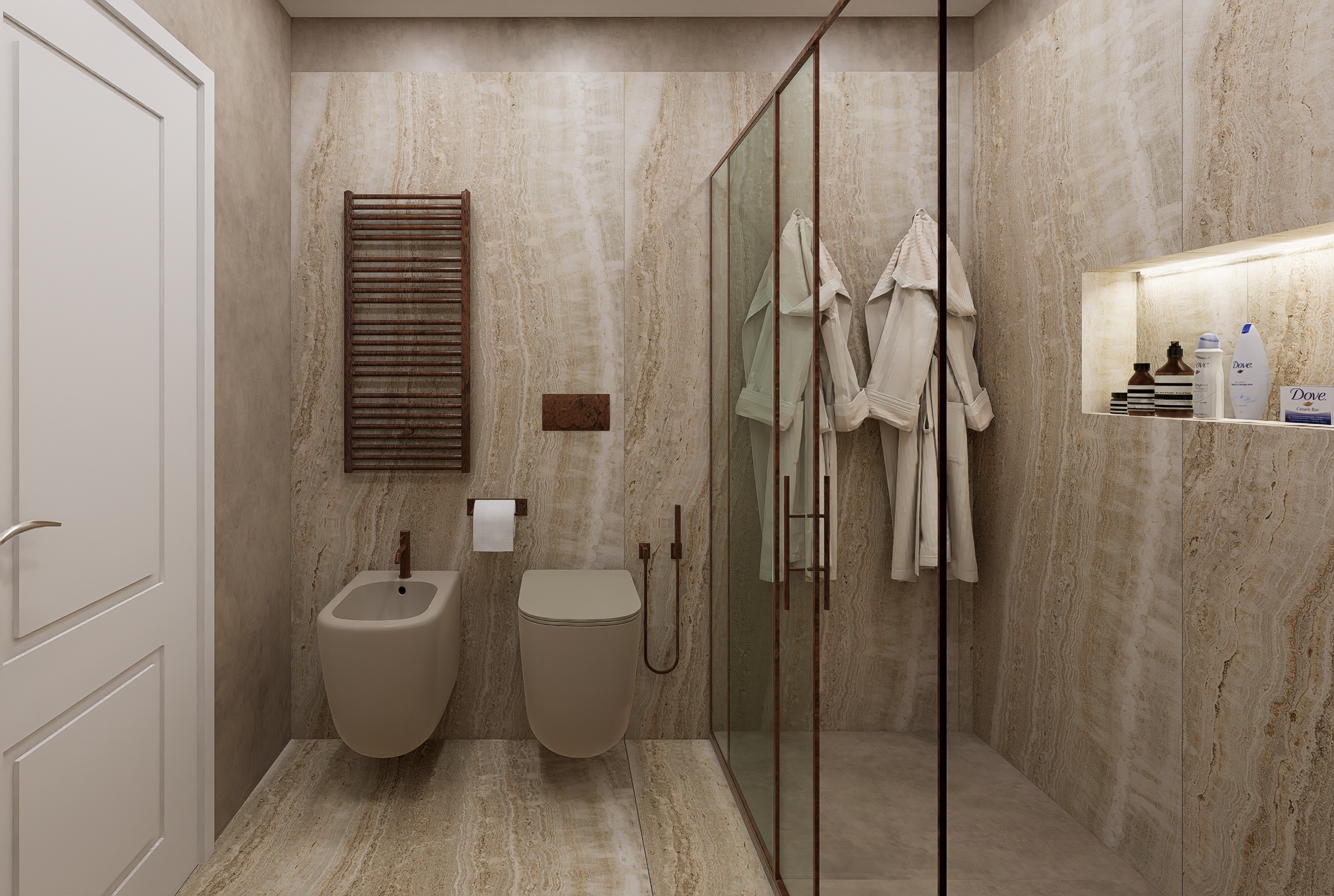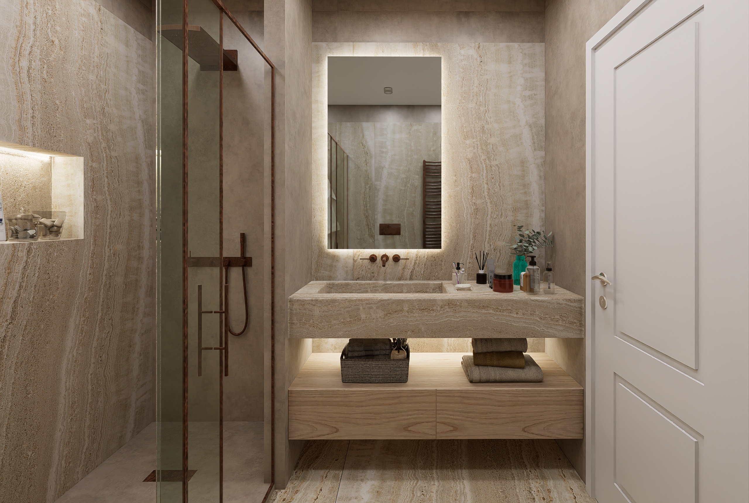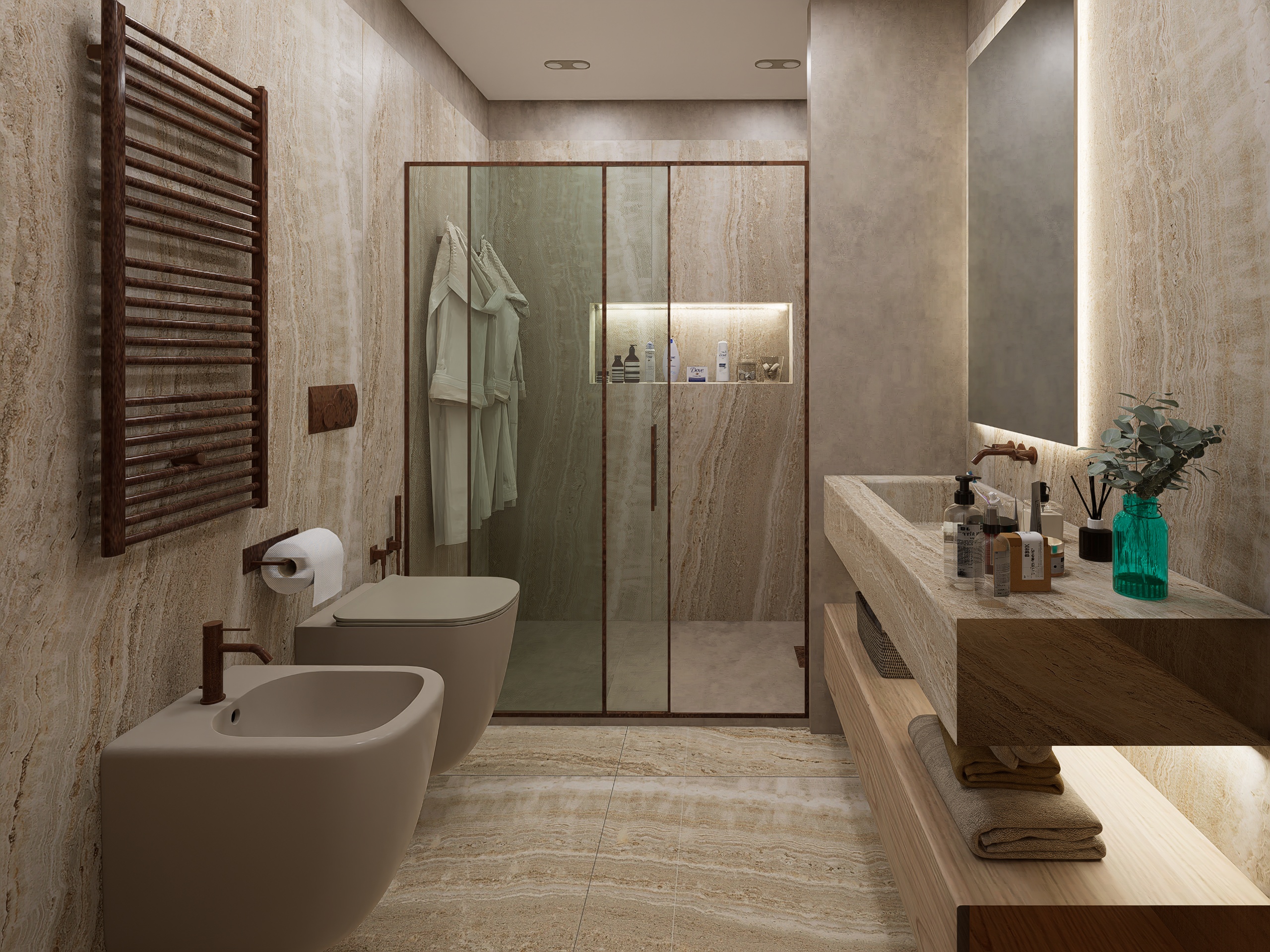 **Theme:**Bathroom finished with porcelain stoneware cladding in a travertine effect. Artist: DIFOCA GROUP ARCH Graphics Card: GTX 1070 16G