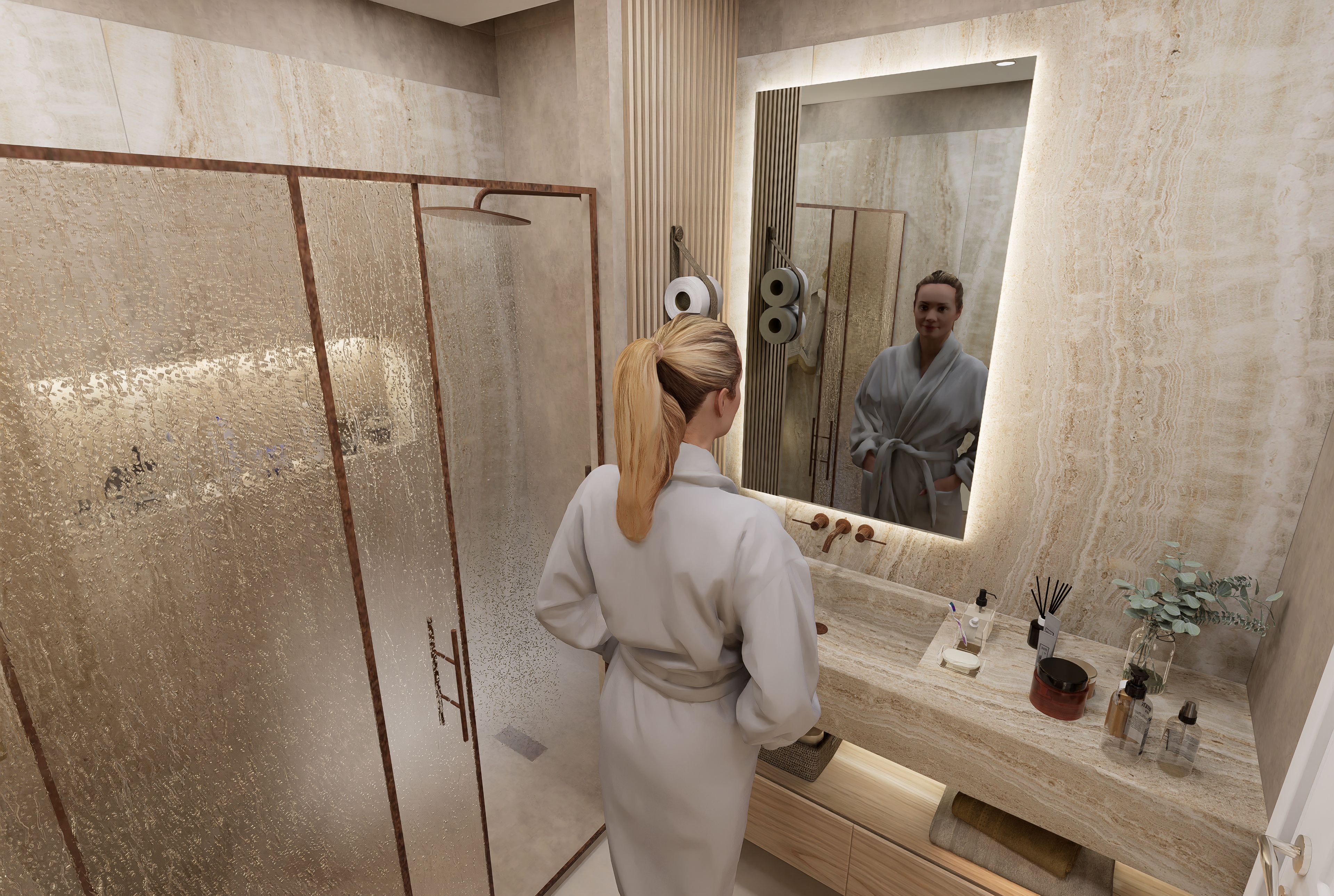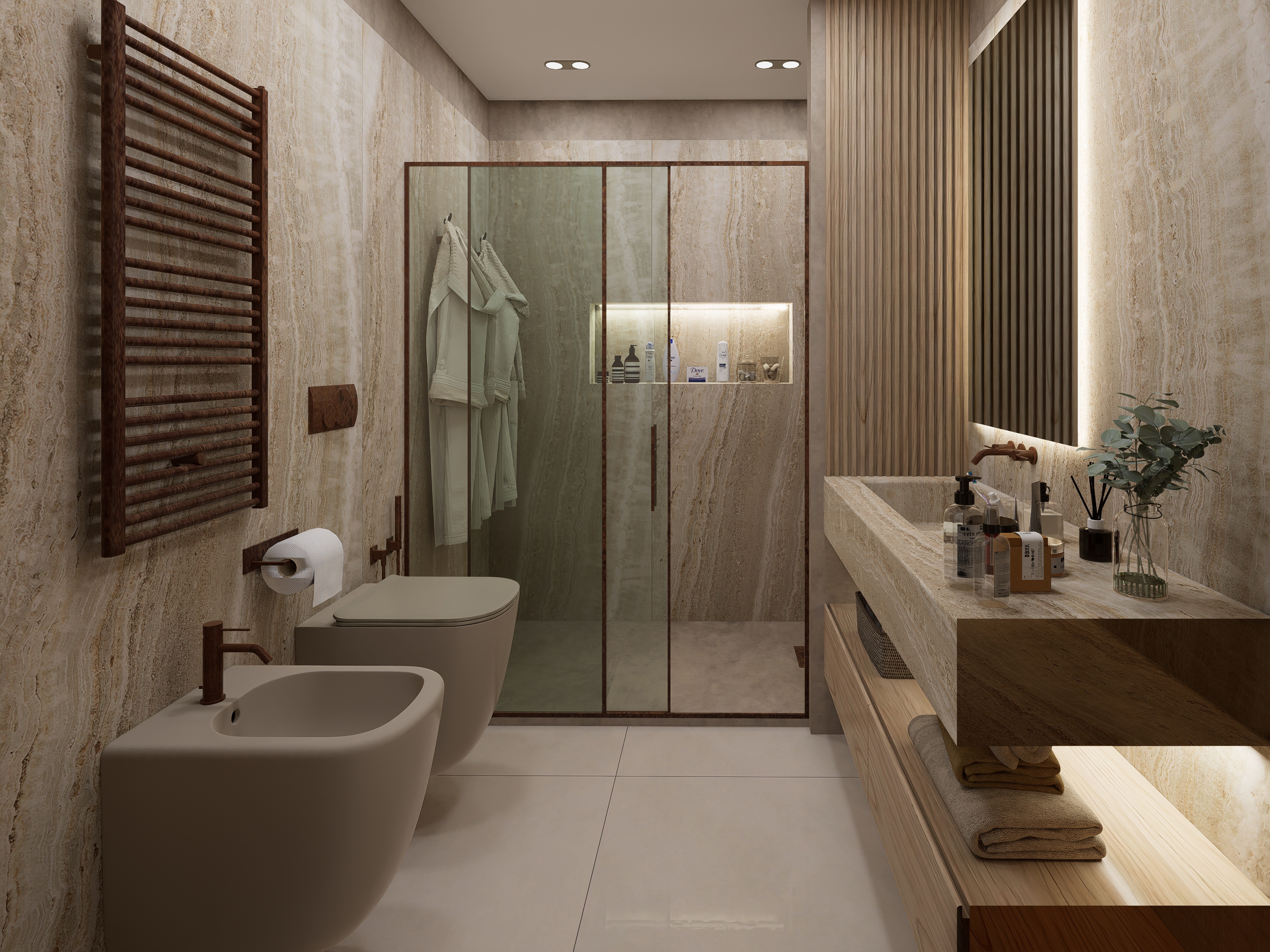 **Theme:**Bathroom finished with porcelain stoneware cladding in a travertine effect.