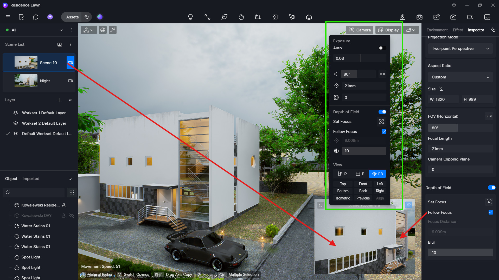 For instance, with the picture-in-picture feature of the advanced camera, you can edit the scene while previewing the composition and rendering effects from different perspectives.