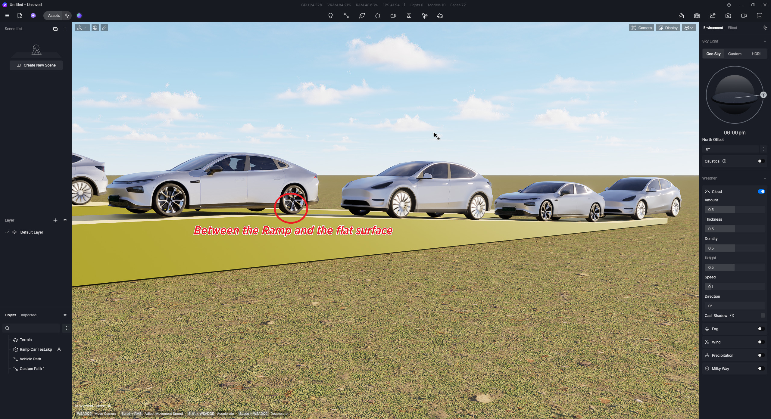 If possible, can you send us this file? Or perhaps the portion of the file where the ramp and the vehicle assets are present? You may send it to support@d5techs.com and have it titled Clov-Forum Car floating to the ramp.