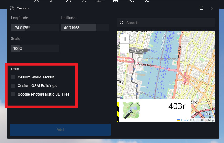 Issue Description: I am consistently encountering the “403r: Referer is required” error on the Cesium map. More importantly, the ‘Add’ button at the bottom of the UI is completely disabled (greyed out/inactive), so I cannot generate any models or even test the feature. This issue persists regardless of the zoom level. I have already tried disabling Norton AntiVirus and the Windows system firewall, but the ‘Add’ button remains unclickable and the error message stays on the screen.