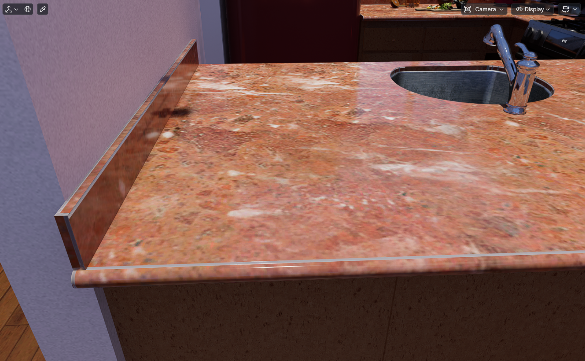 Attached is a screenshot showing the Red Pearl Marble countertop, and the grey tiling lines along the front and left edges. This was the best I could do to get rid of the tiling lines by scaling up the texture, but I don’t know why this can’t be seamless at normal scaling.