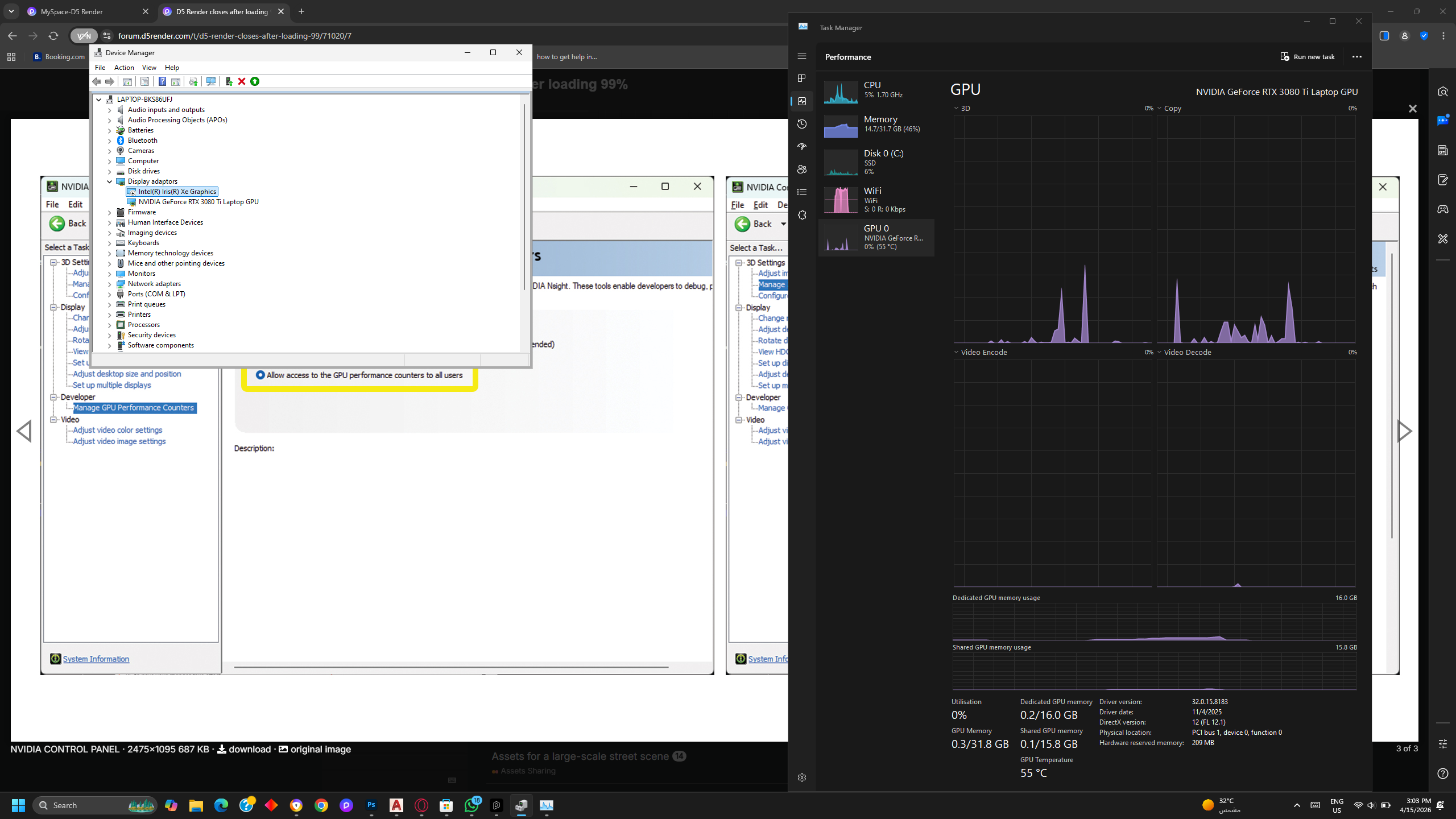 D5 Render Version:3.0.1 Graphics Card: Nvidia Geforce RTX 3080 Ti Laptop GPU Driver Version: Game-Ready driver = 581.83 and Studio Driver = 591.74 Issue Description: I try to open a new project from launcher, D5 render app opens the loads to 99%, then it closes the D5 render app Screenshots/Videos Description: Steps to Reproduce (optional):I try to open a new project from launcher, D5 render app opens the loads to 99%, then it closes the D5 render app