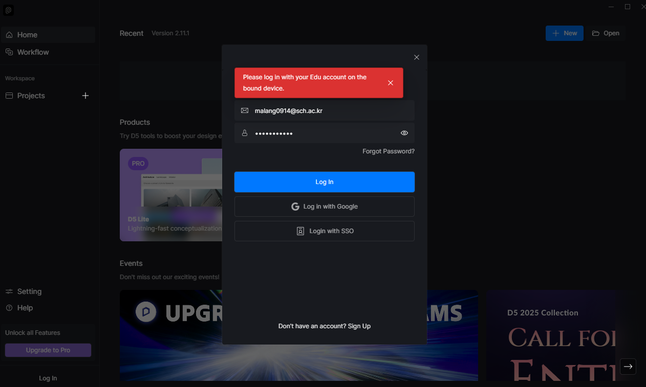 Please note that the Edu License is a fixed-seat license, which means it is bound to the device where it was first activated. If you attempt to log in on another device, the D5 Launcher login may fail even if the account credentials are correct.