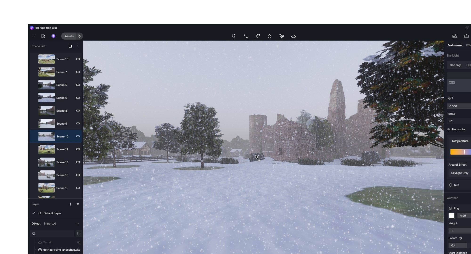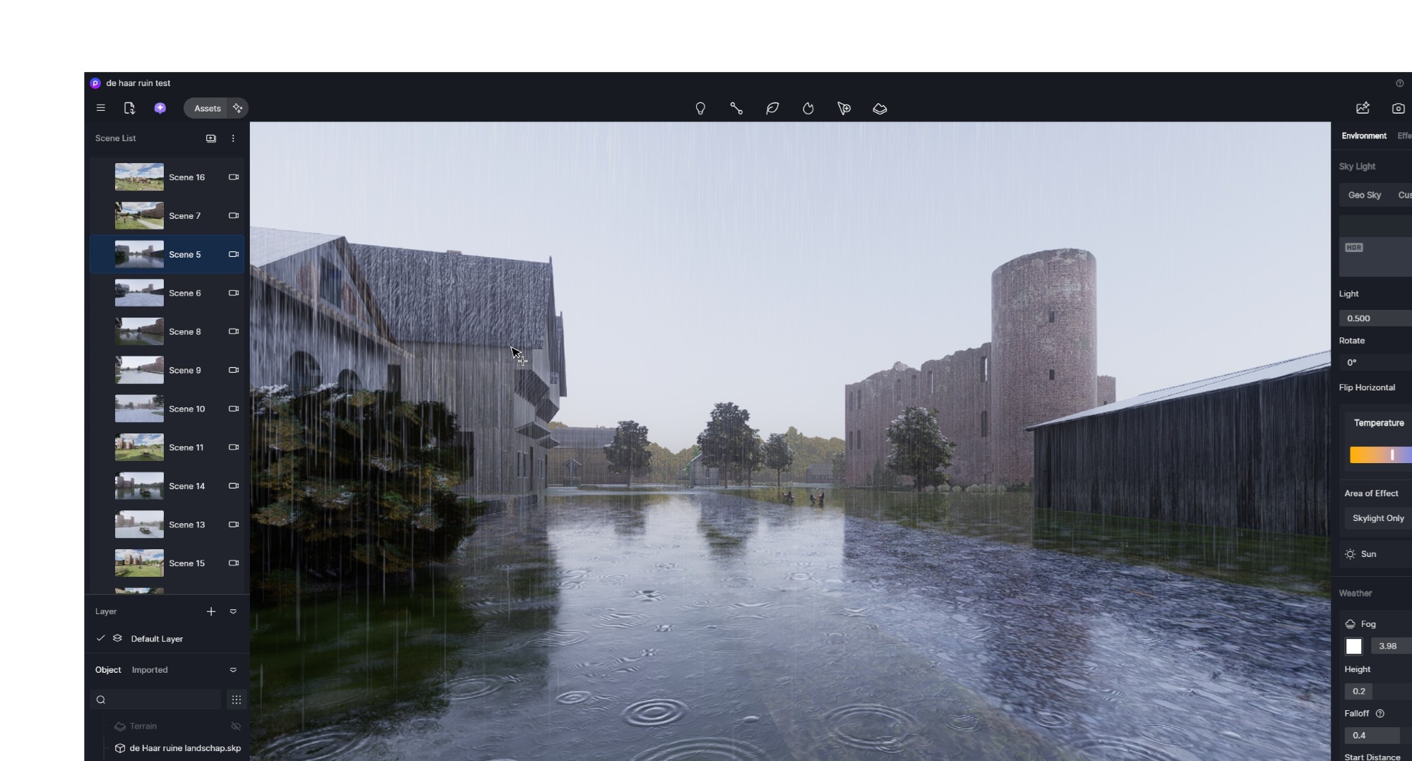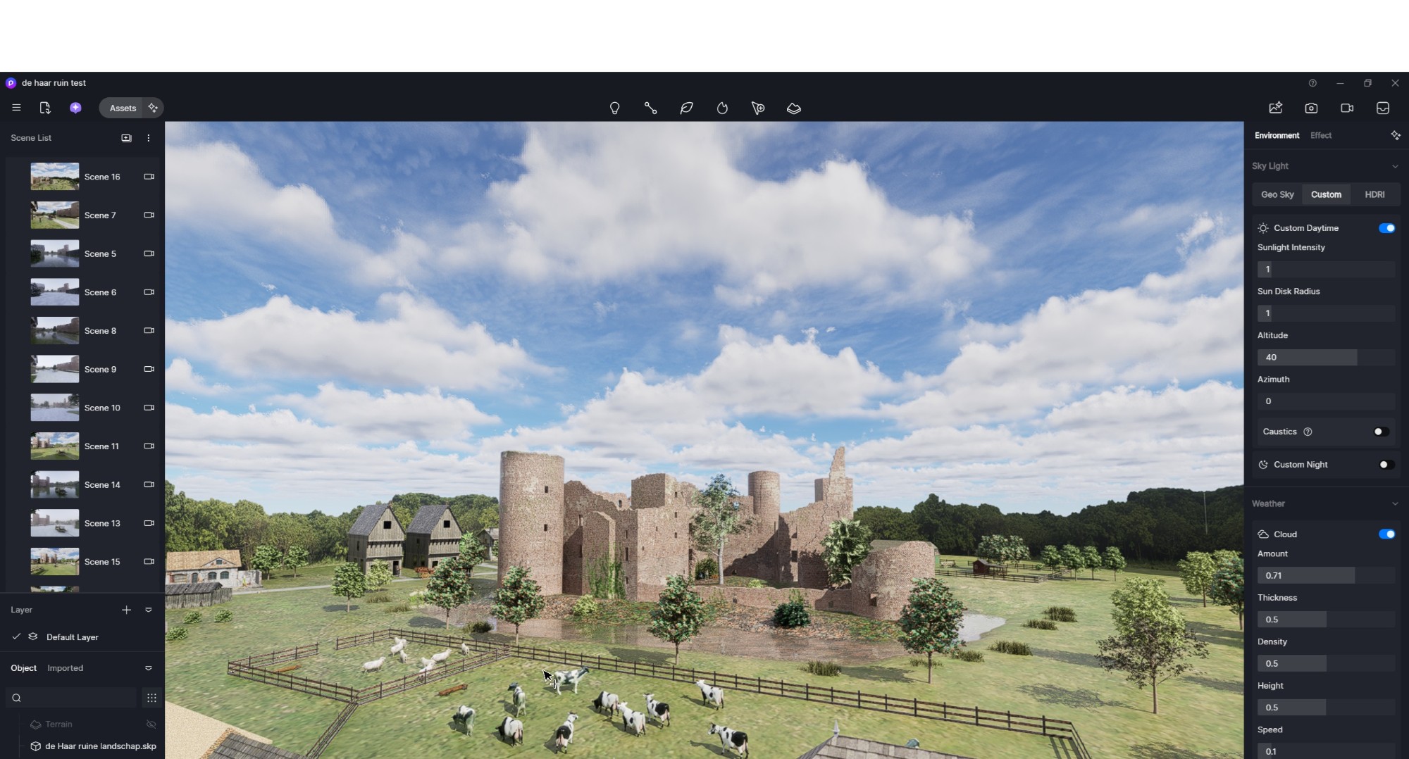 Currently working on a videoclip about the Seasons Ruin de Haar. The entire landscape, with a diameter of 200 meters, was created in Sketchup. I then continued with the free version of D5 Render for the seasons (see pictures 1, 2, and 3). To make the landscape’s surface more realistic (it currently has flat textures), I’m running into a few problems. When I scatter the landscape with terrain grass, the image looks strange (picture 5). Close looks good but with more distance, large gaps appear. When I scatter with material grass, the landscape is very unrecognizable and monotonous from a distance. I also want to vary the grass landscape. This would be possible if I could, for example, change color and height of the grass locally. How do I edit grass? And how do I do that locally in the free version? I’m experimenting, but any help would be appreciated.