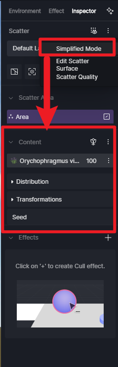 - Try changing the Cull Distance; this will affect how scatter is shown in a given distance. Although a greater number will signify more scatter, which will increase VRAM Usage.