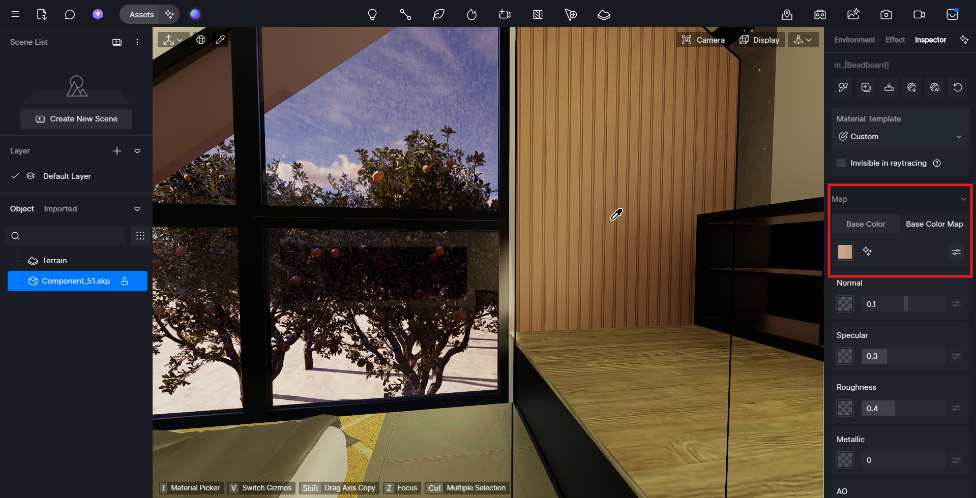 You can edit a SketchUp material in D5 by using the Material Picker (i) and clicking the surface you want to edit. The material settings will appear on the right panel for adjustment.