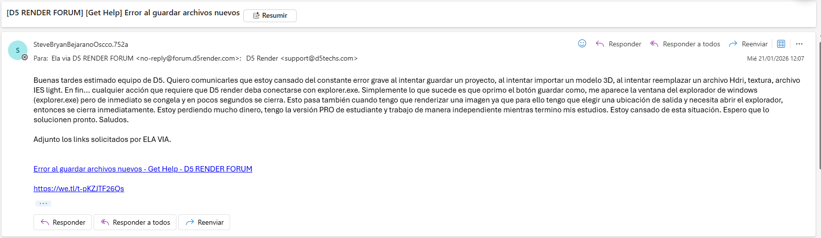 Este error está afectando directamente mi flujo de trabajo y productividad, ya que resulta muy tedioso perder el trabajo realizado en proyectos nuevos. Agradecería mucho su apoyo para identificar la causa del problema y brindarme una solución lo antes posible.