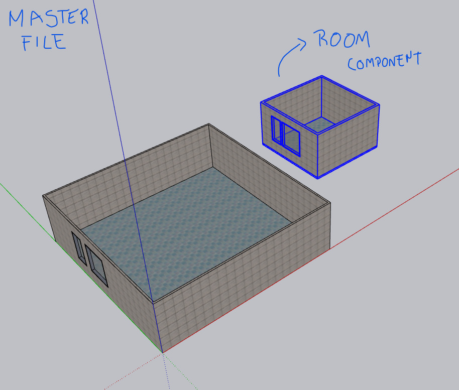 At first, I tried doing this directly in SketchUp by saving each room (e.g. Master Suite, Kitchen, Bathroom, etc.) as a component, then using Save As to work on each room in separate files and reloading them into the master file. That approach didn’t work very well, since reloading each file after finishing it took a very long time.