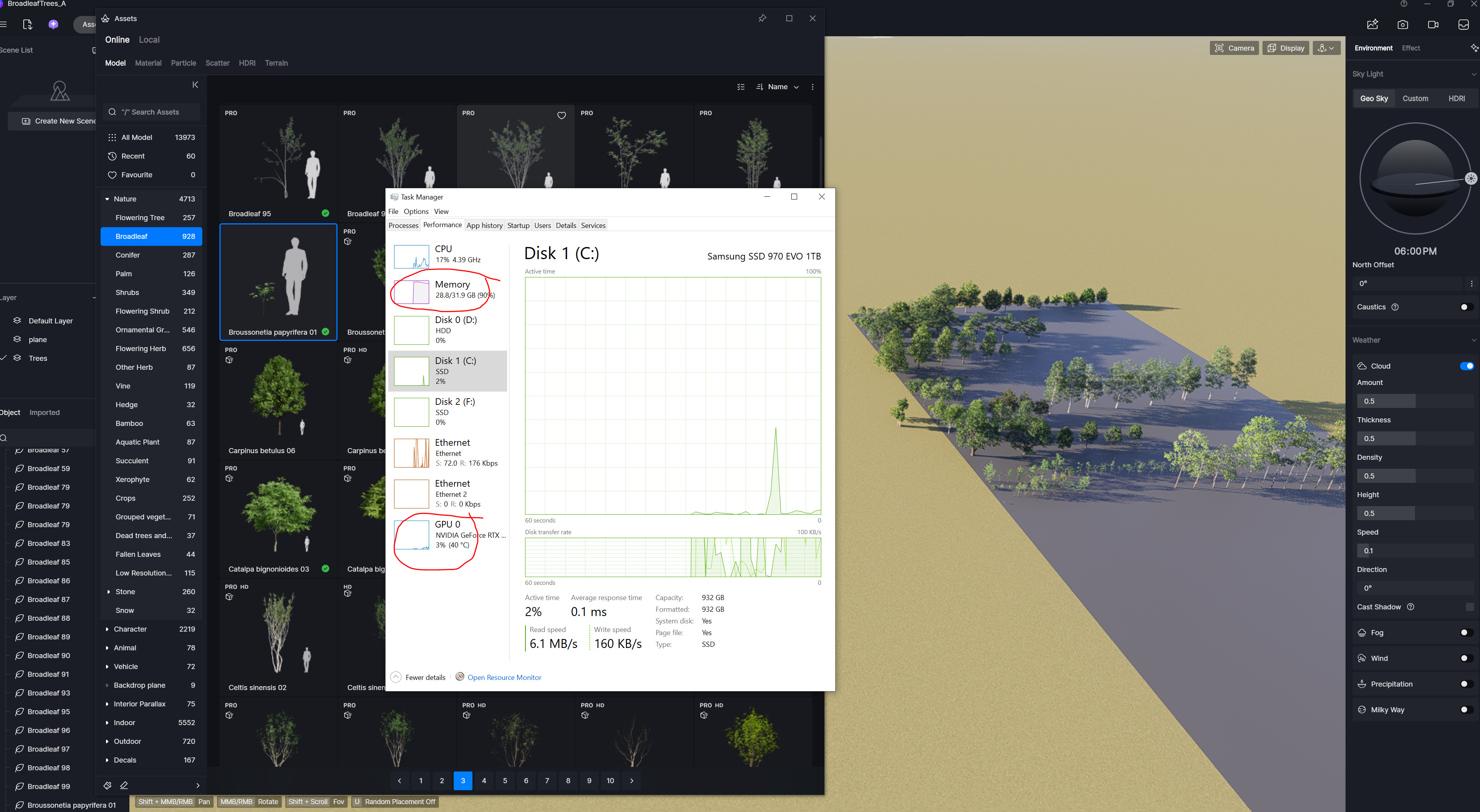 I tested with a more modest scene. I put only 70 low poly vegetation assets (all different).