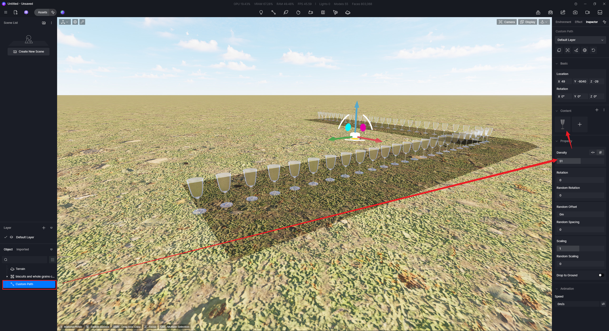 I tried to use the ne custom path function with pro models like glasses in a line on a shelf.