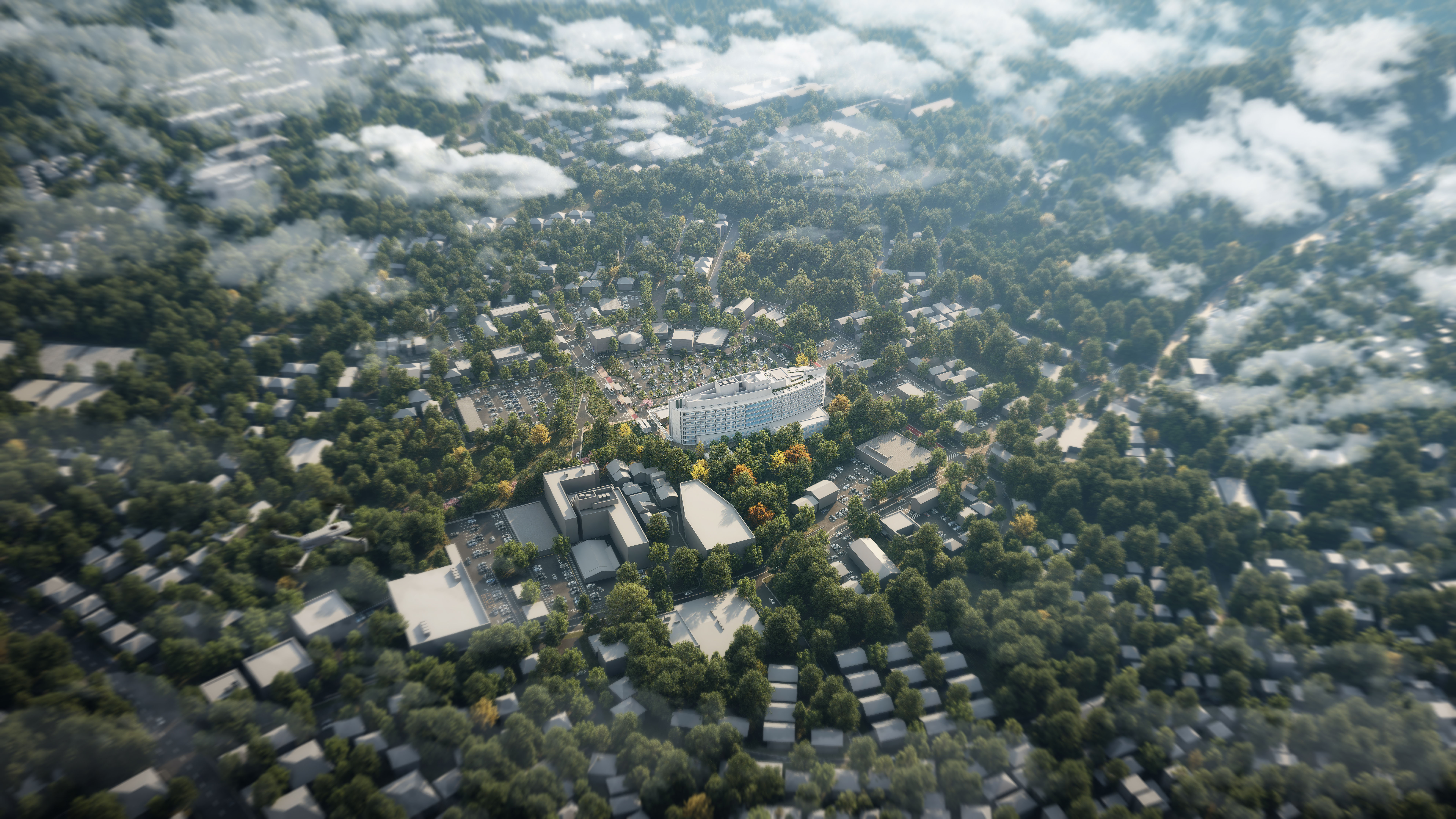 Description of the work: AV8 Studio produced a 3D visualization of the exterior of Hadano Red Cross Hospital, located in Hadano City, Kanagawa Prefecture.