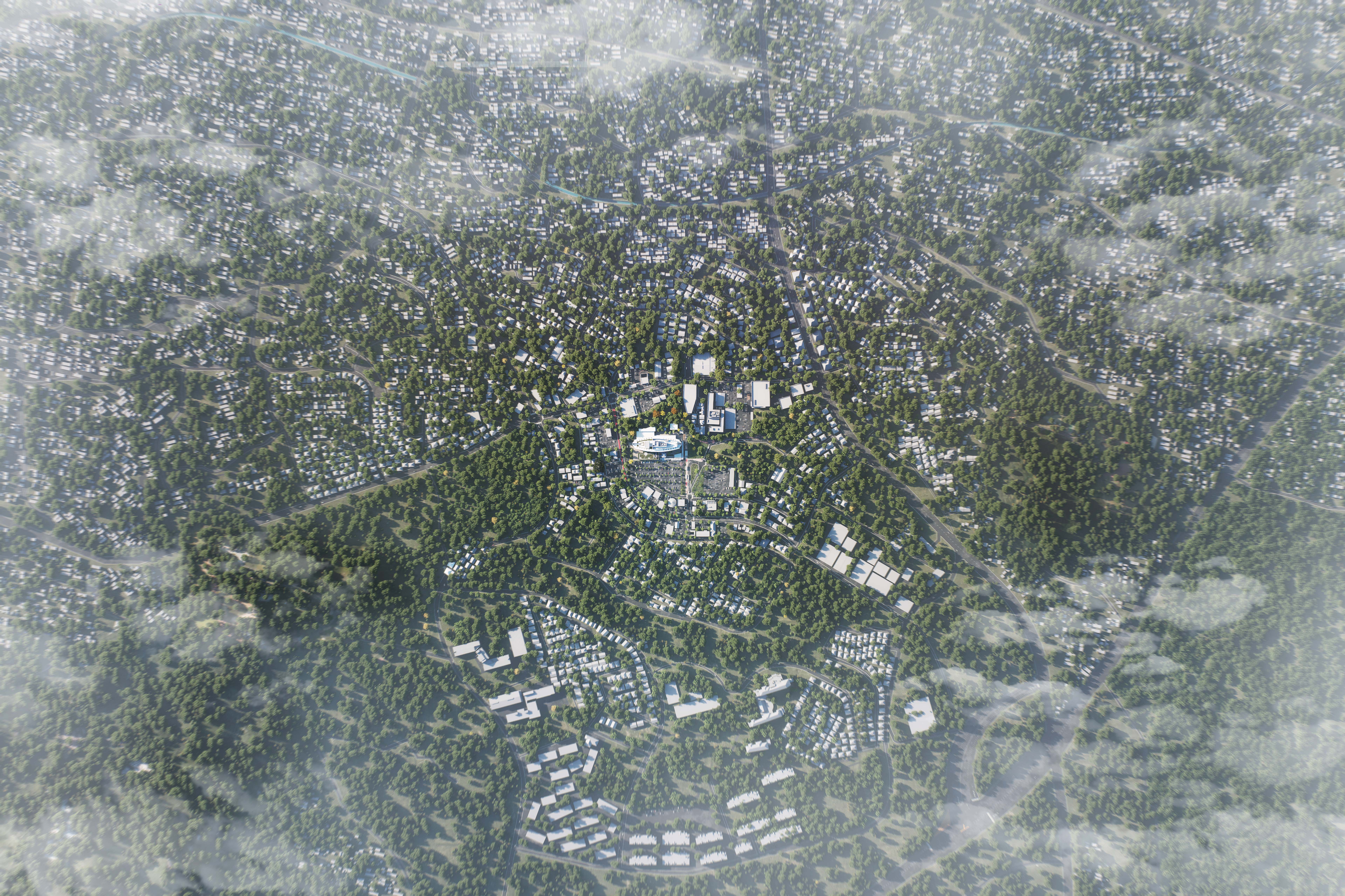 The actual building shape, exterior wall materials, lighting environment, and plant color tones have been faithfully reproduced to match the local atmosphere.
