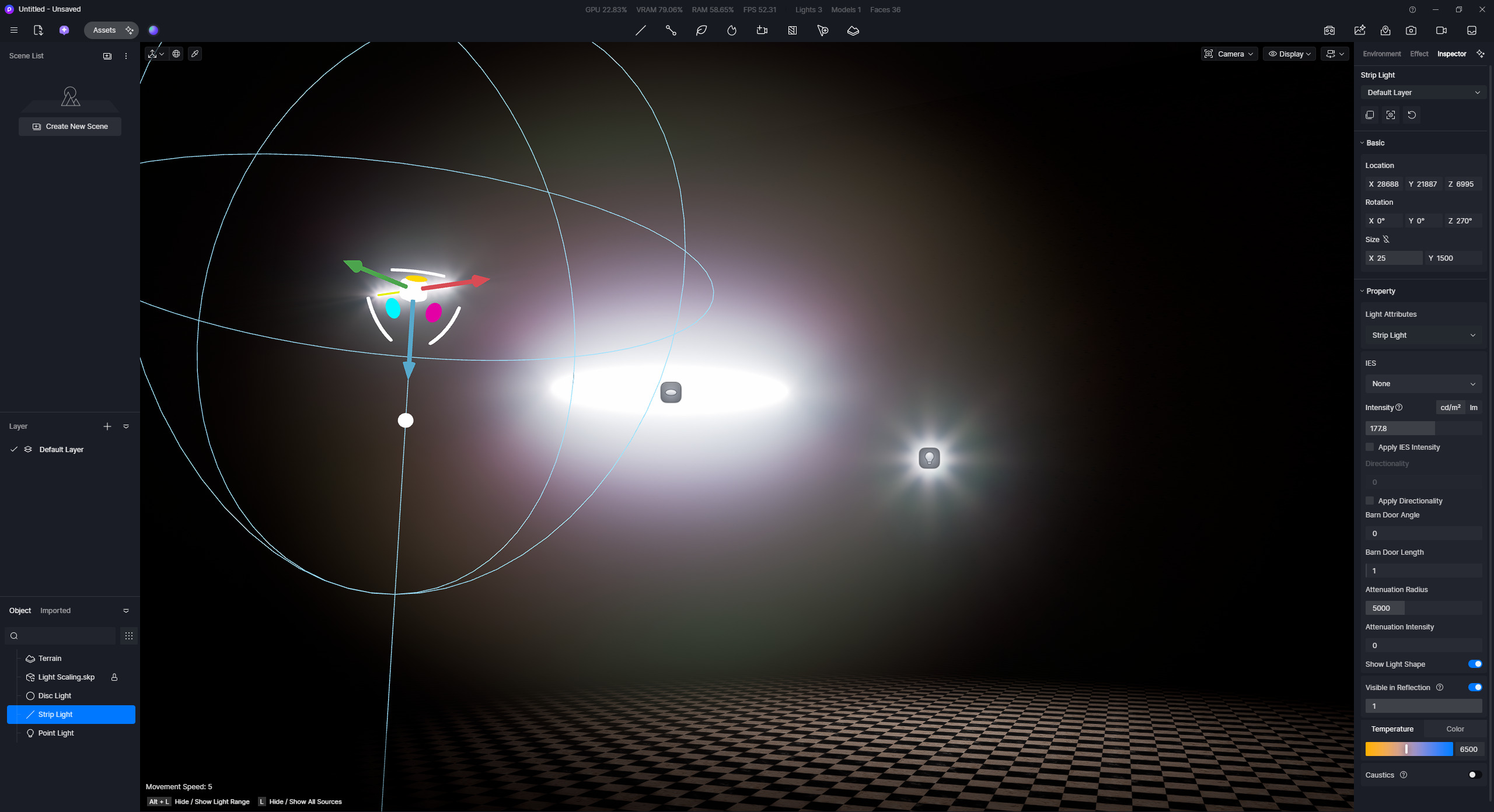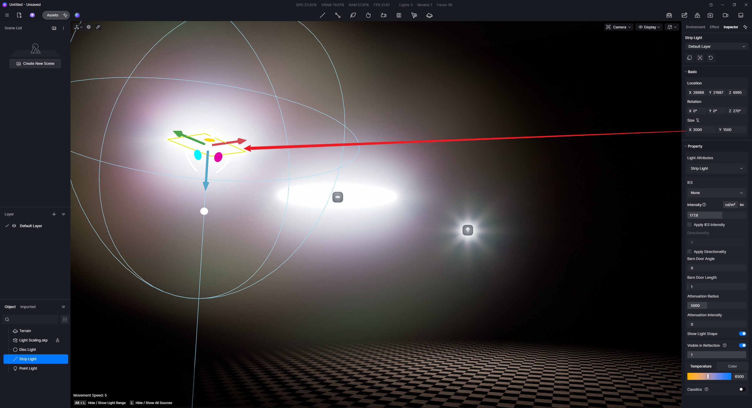 Issue Description: When scaling a light (any light type) above aprox. 25 meters, the light shape scales, but the light intensity doesn’t scale above that.