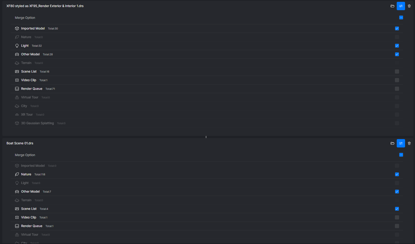 I’m trying to run a D5 merge function. One file is an island scene, and the other is a detailed boat to place in the scene. Upon using the merge project function, everything merges together nicely except the terrain from the island scene. It is greyed out as an option in the merge project selection criteria, and says Total:0, even though there’s definitely terrain there. Is there something I’m missing here? Or can we not import the terrain yet as a merge project function?