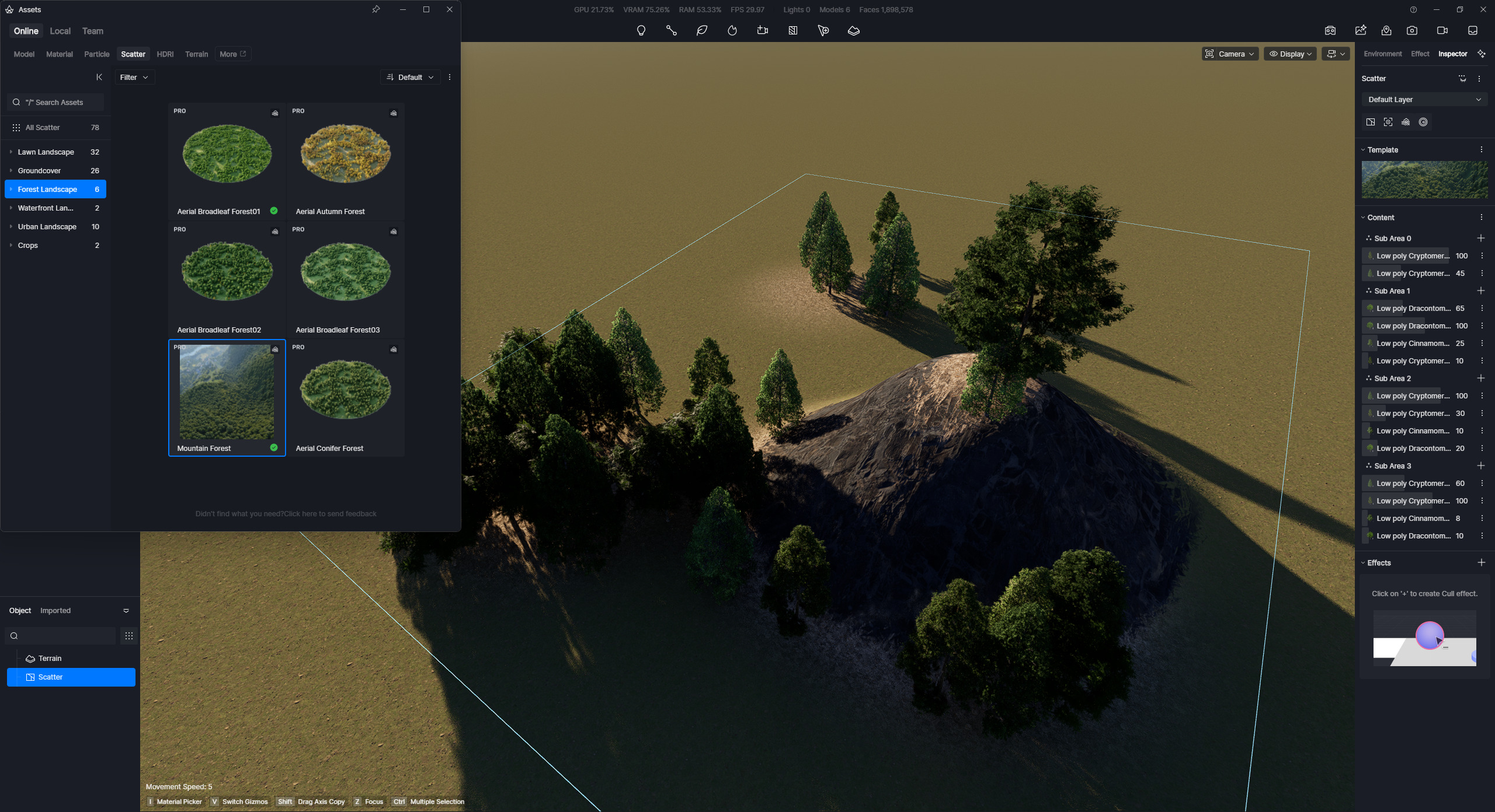 I’m having trouble applying the mountain forest scatter pattern. I click on the thumbmail, it loads for a while, and then nothing happens. I can’t apply the scatter to the area. I tried doing a clean data and nothing. I can’t apply this preset to any of my projects.