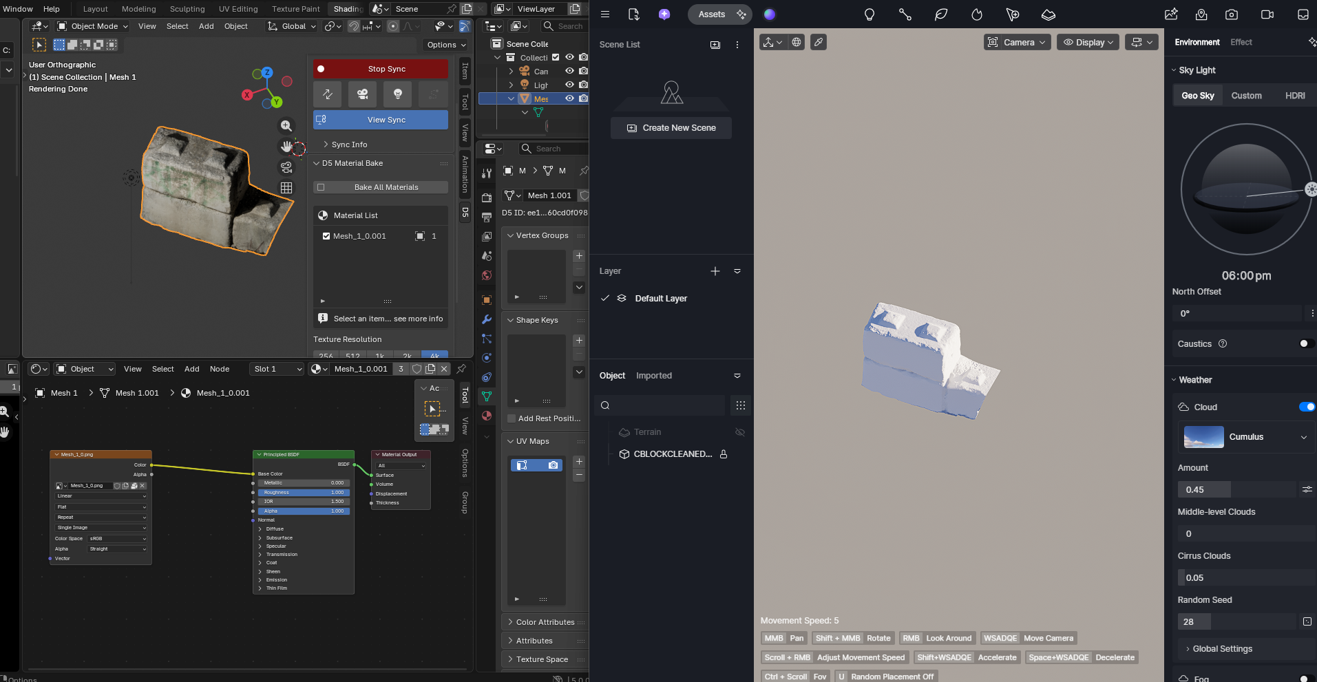 Hi all, I’ve been trying to import a photogrammetry scan (concrete block) from Blender into D5 Render and have been hitting walls for hours. The mesh has a single UV-mapped diffuse texture (Mesh_1_0.png) that looks perfect in Blender but won’t transfer to D5.