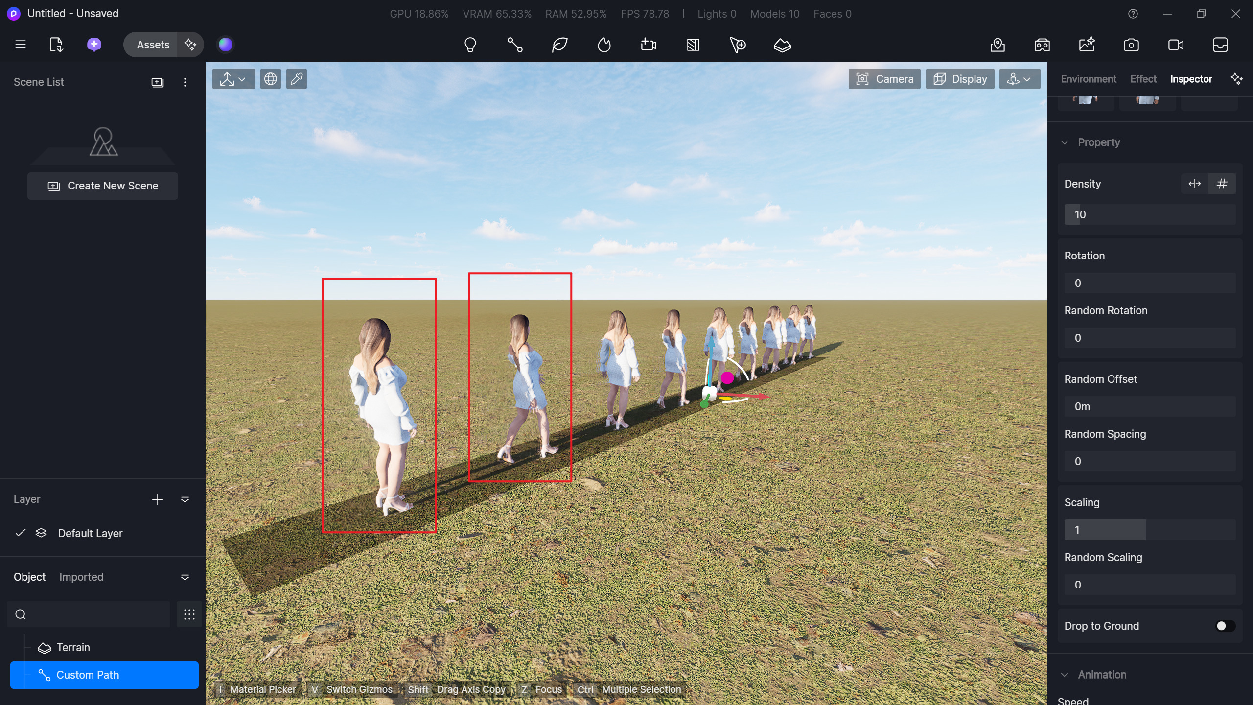 Although some of the assets that you have selected are dynamic, you need to ensure that their labelled movement is sufficient to make it seem they are walking the assigned path. For example, “Betty Looking Around” is not efficient to be placed in a path since she does not have a walking motion, unlike “Betty Walking”