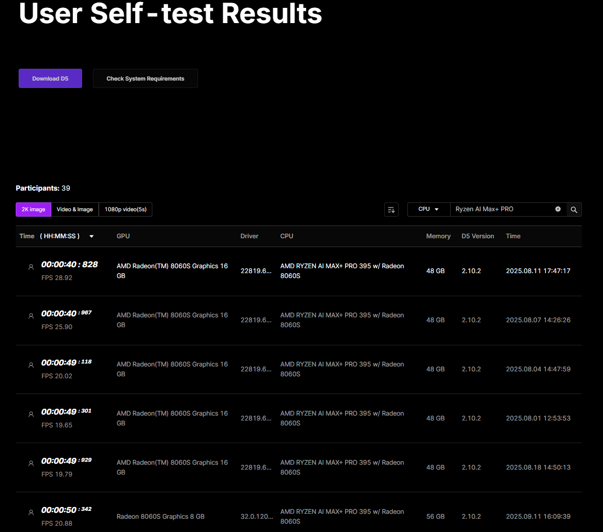 D5 is heavily reliant on dedicated GPUs. Ryzen AI Max PRO 395 is a processor/CPU; it doesn’t really have a significant impact on D5 since the software draws its power from your dedicated GPU.