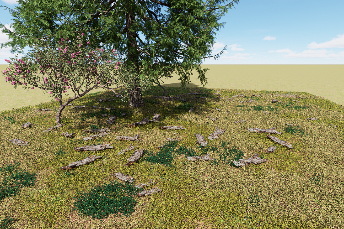 Smolak, in that case, why not use a custom path with your tree bark? Playing with density, custom offset, and random size. Here again are bark chip trees from Quixel with a single custom path.