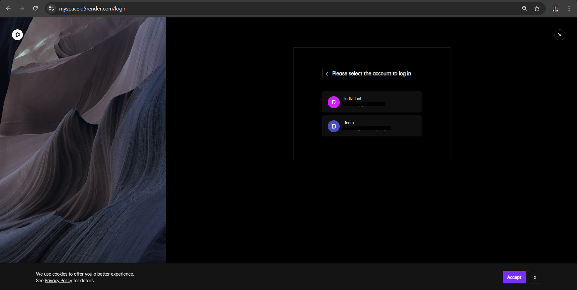 When I log in through the website, I can see both “Individual” and “Team” options, but the D5 Launcher automatically logs me into the Individual/Free plan every time, and I cannot switch to the Team license.