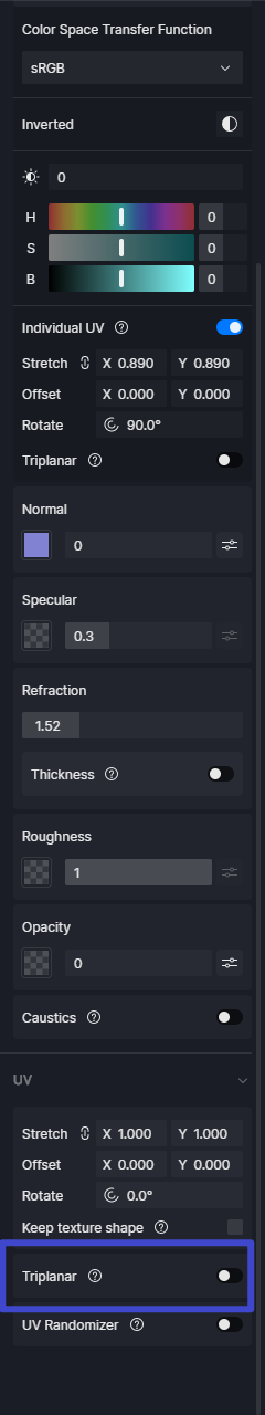 - If tri-planar does not suffice, then I think changing the texture from your 3d Modeling software just to differentiate this portion would be a better option, since you’ll be able to control the texture compared to having it as a monolithic material. Of course, the material should be the same, just the material from your 3d Modelling software should be different.