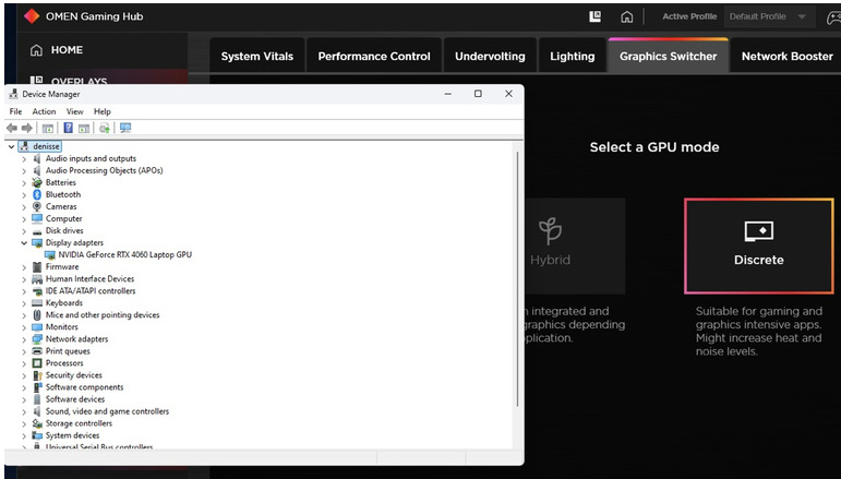 If you’re using HP Omen and HP Victus, visit the built-in application for HP Devices. Select ‘Discrete’ GPU mode in ‘OMEN Gaming Hub-Graphics Switcher’.
