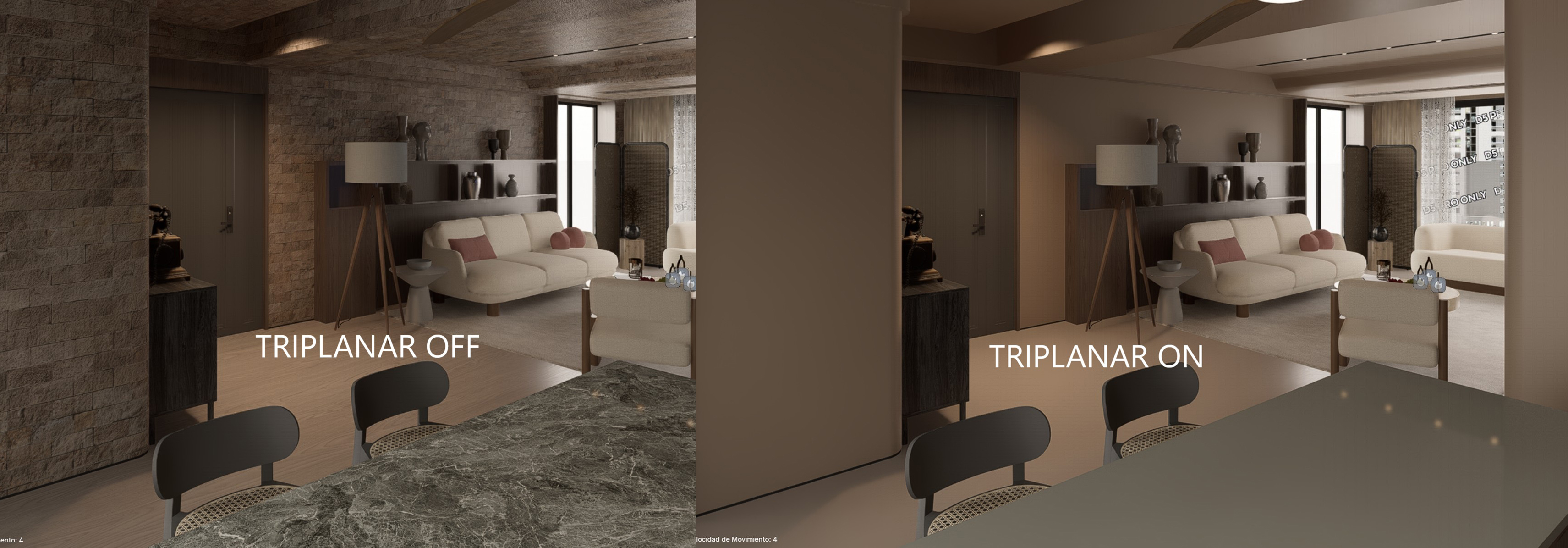 Could someone please help me with this problem? Now, every time I enable Triplanar on any material, it loses its texture and has a shiny, textureless finish. I don’t know why this is happening; it didn’t happen before, and I don’t remember updating or changing any settings on my computer. My computer has an AMD Radeon RX 7900 XT with 20 GB of RAM. I’ve attached an image showing how the wall, floor, and countertop materials look with and without Triplanar.
