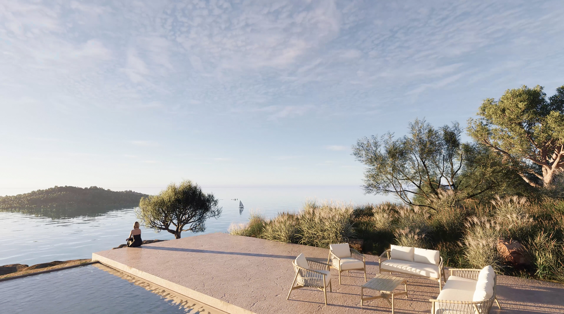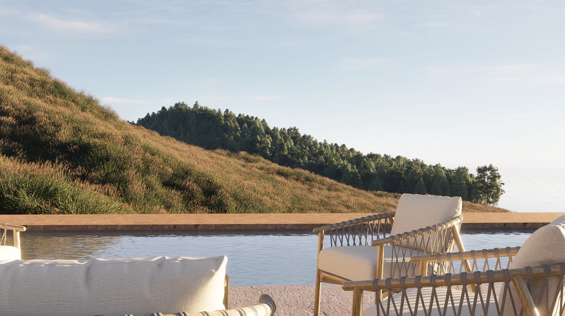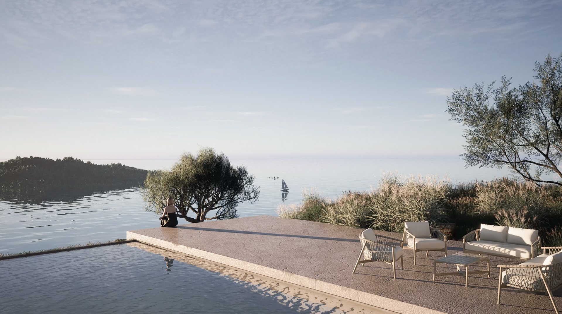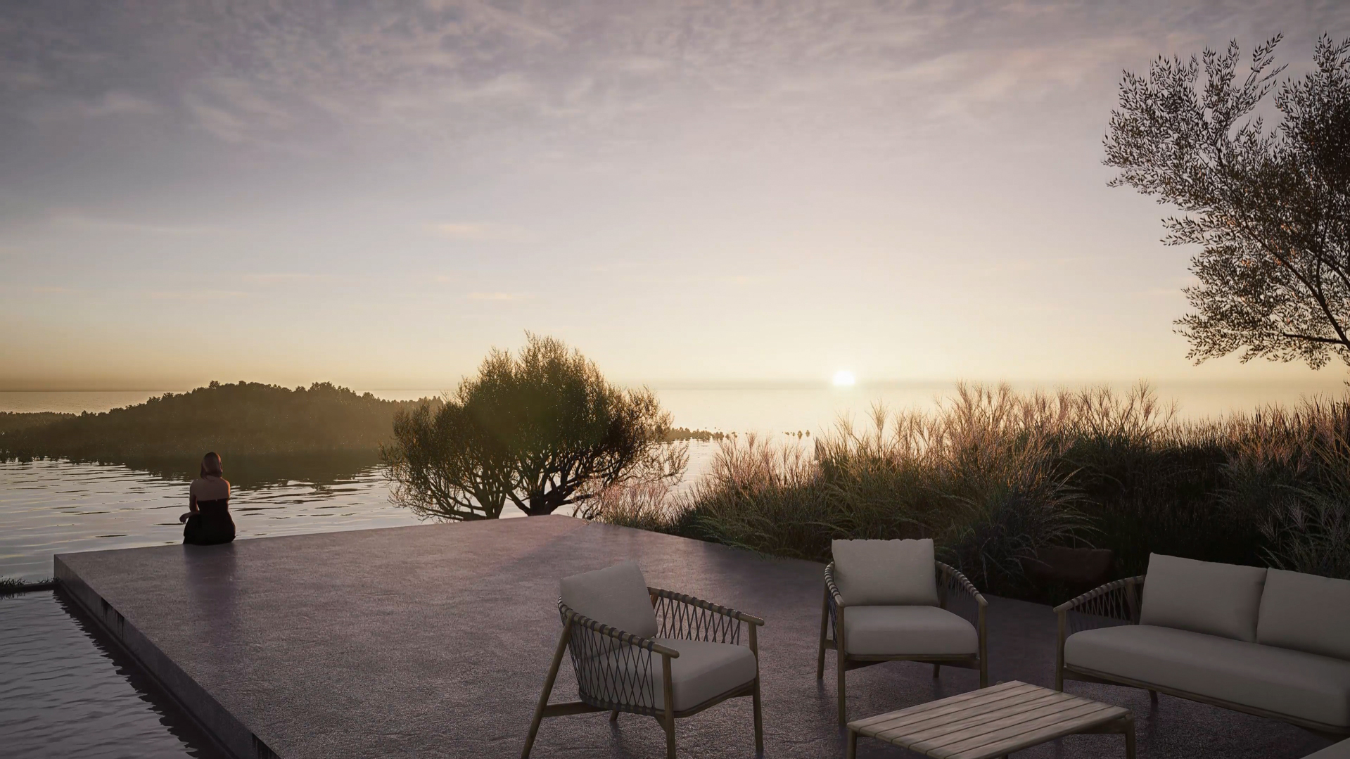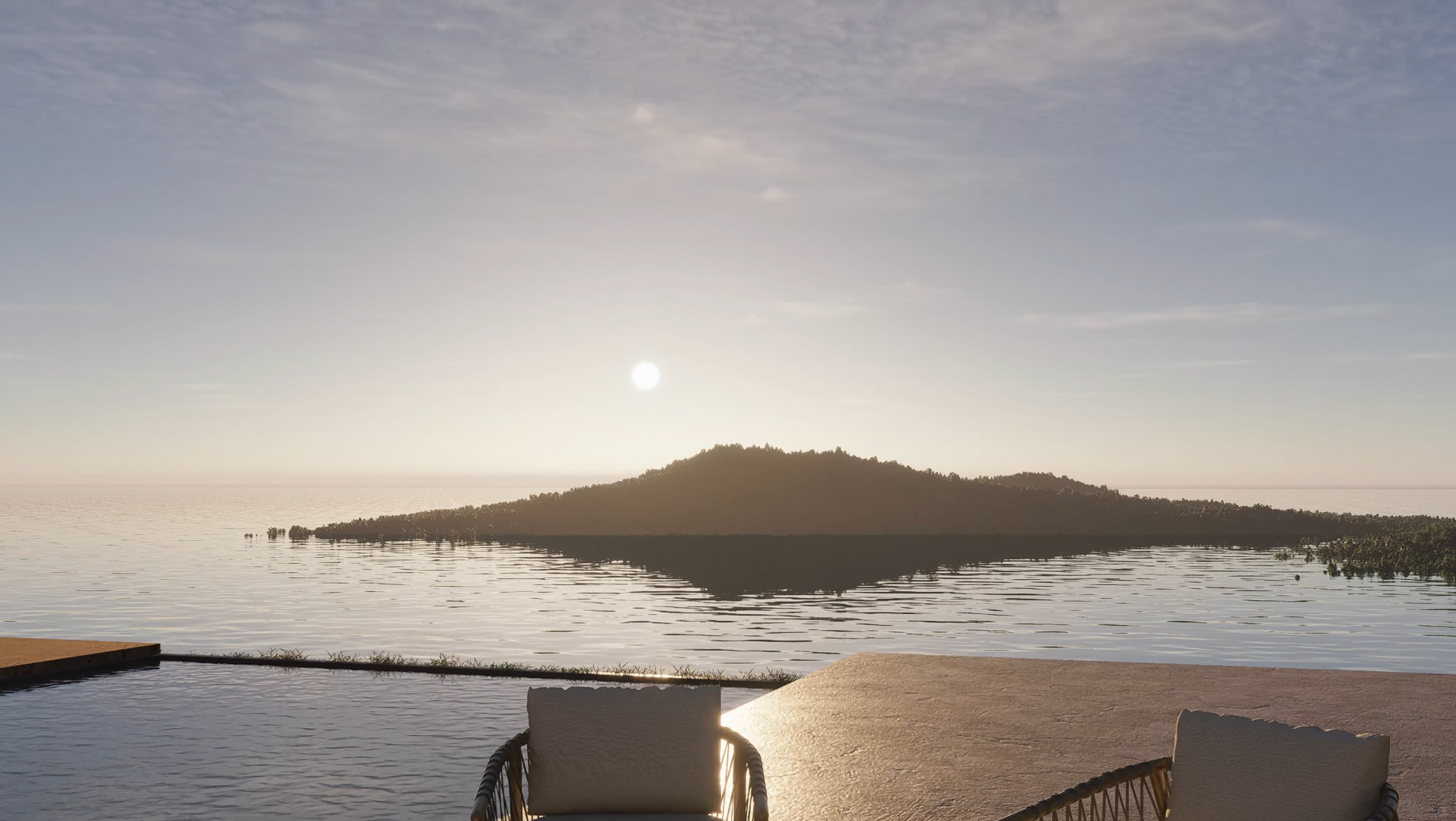The focus was on soft lighting, natural reflections, and a peaceful atmosphere where architecture blends seamlessly with nature.
