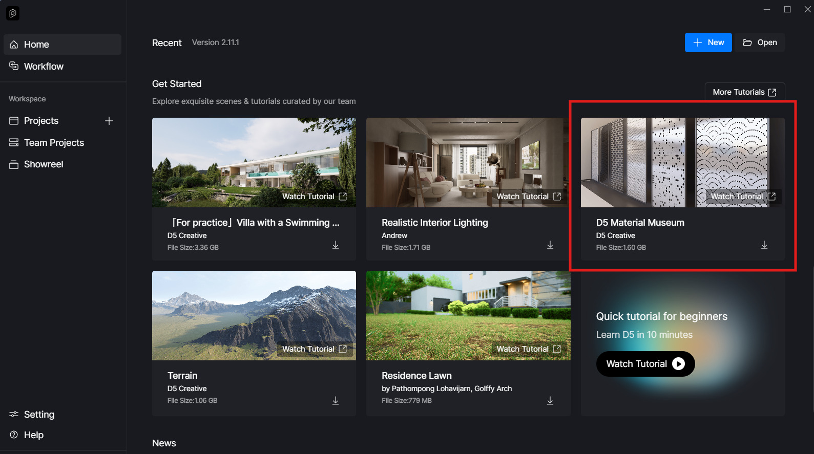 I saw the same video on YouTube about the Material Museum. However, D5 Render now has a new version, and I no longer see a start page — it has been replaced by a launch page that opens via the D5 Launcher. In here I cannot find this Material Museum file.